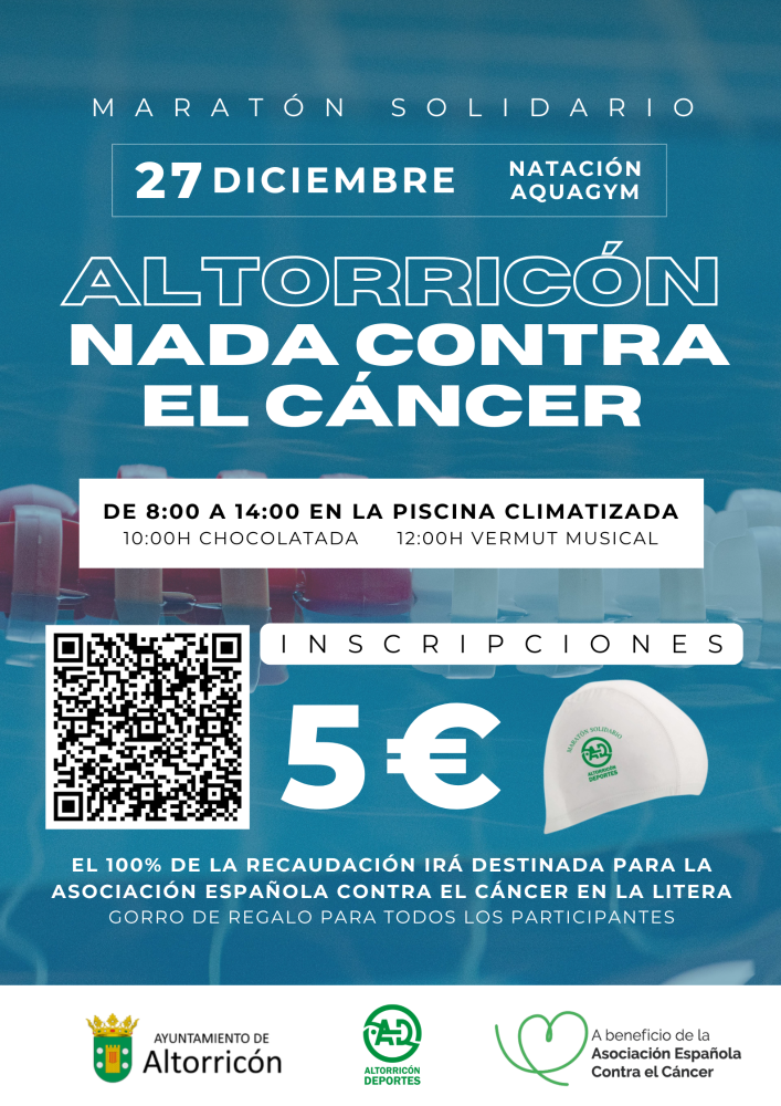 Altorricón nadará contra el cáncer el próximo sábado 27 de diciembre. De 8:00h a 14:00h la Piscina Climatizada del Espacio Deportivo acogerá un maratón acuático solidario a beneficio de la Asociación Española Contra el Cáncer en La Litera.