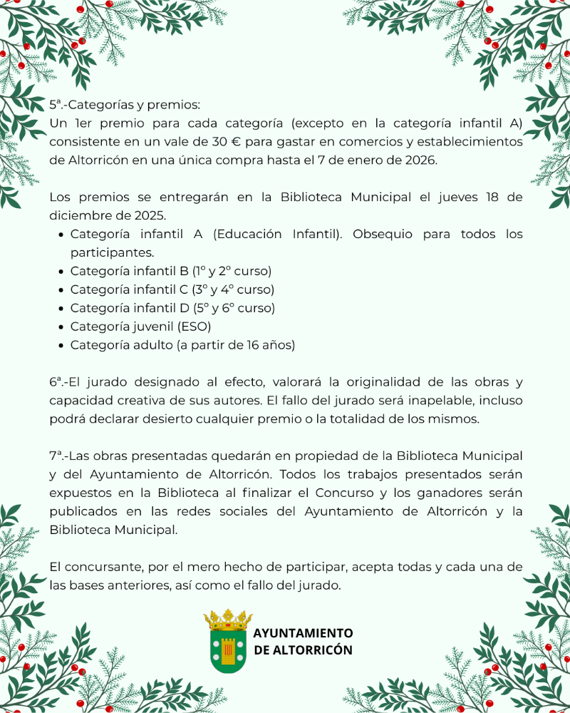 Un 1er premio para cada categoría (excepto en la categoría infantil A) consistente en un vale de 30 € para gastar en comercios y establecimientos de Altorricón en una única compra hasta el 7 de enero de 2026.