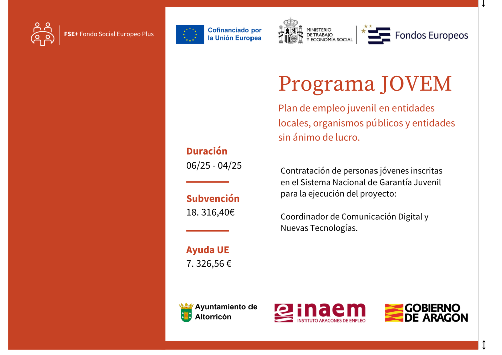 Programa JOVEM. Gobierno de Aragón. Instituto Aragonés de Empleo. Programa FSE+ Aragón 2021-2027. Subvención financiada en un 60% por fondos propios del Gobierno de Aragón y en un 40% por el Fondo Social Europeo Plus.